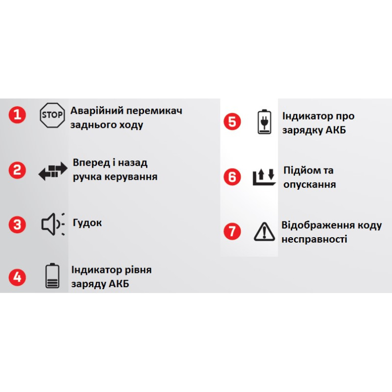 Наявність аварійного перемикача заднього ходу у разі надзвичайної ситуації це захищає оператора та оточуючий персонал.